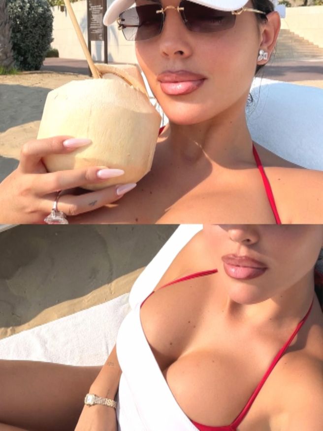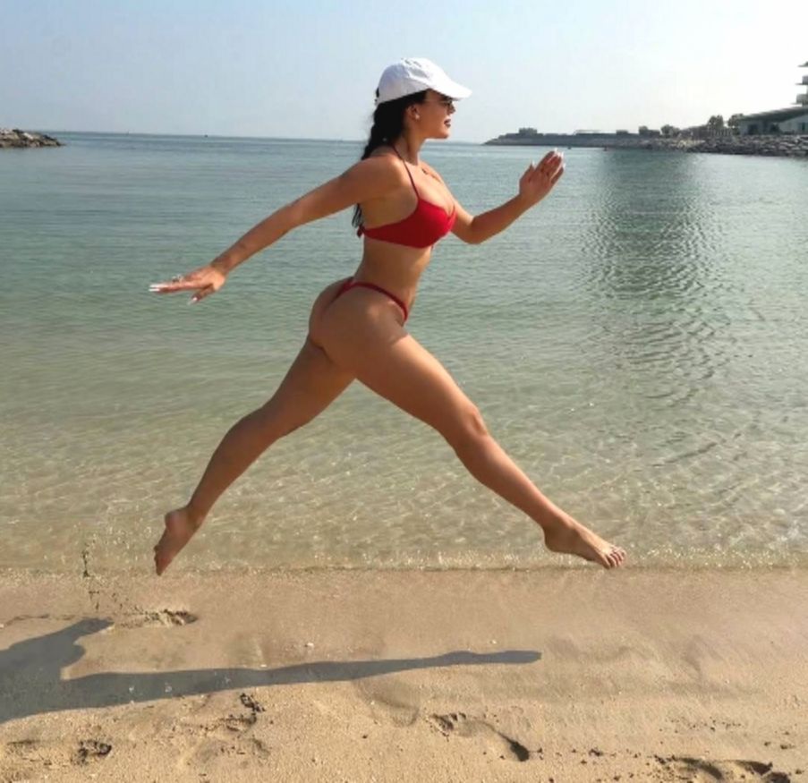 Первым фото девушка поставила собственное. Джорджина вышла на пляж в красном бикини, прикрыв голову белой бейсболкой. Модель сняли, когда она совершила эффектный прыжок.