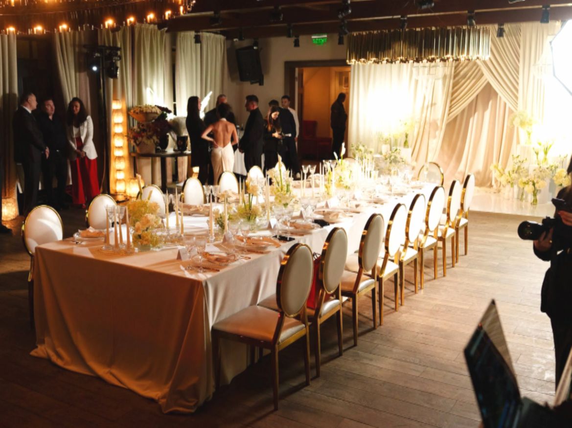 Оформление праздника было выдержано в нежных золотисто-бежевых тонах. С первого взгляда гости поняли, что это не просто день рождения, а настоящее торжество любви.