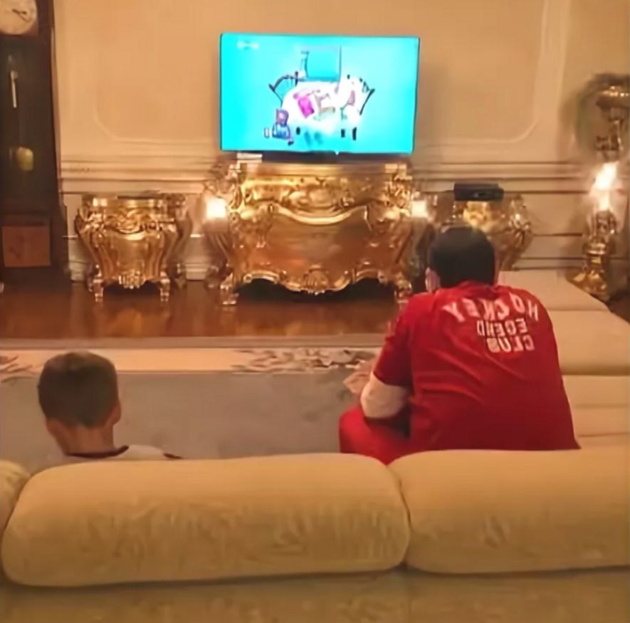 Телевизор здесь стоит на массивном столике с богатой отделкой, который поклонники в шутку сравнивали с версальскими интерьерами.