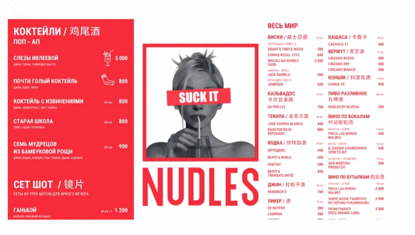 Не зашел публике и ее открытый в Столешниковом переулке Москвы ресторан азиатской кухни Nudles by Ivleeva. Где в меню гостям предлагались коктейль «Слезы Ивлеевой» и коктейль «С извинениями».