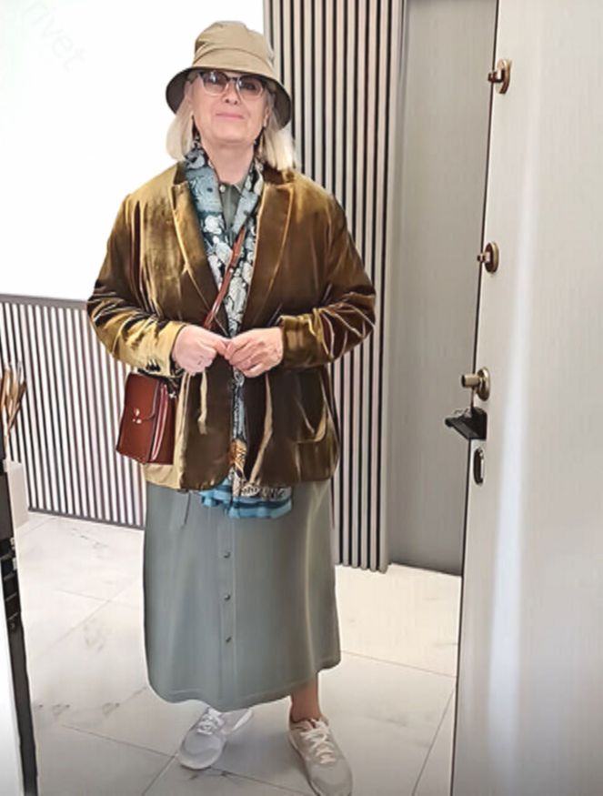 Например, серая юбка макси — отличное решение. А вот панама и золотой жакет здесь лишние. Куда лучше подошли бы водолазка, футболка, лаконичный жакет или даже кожаная косуха. Но главное — Татьяна не боится пробовать, а это в любом возрасте дорогого стоит.