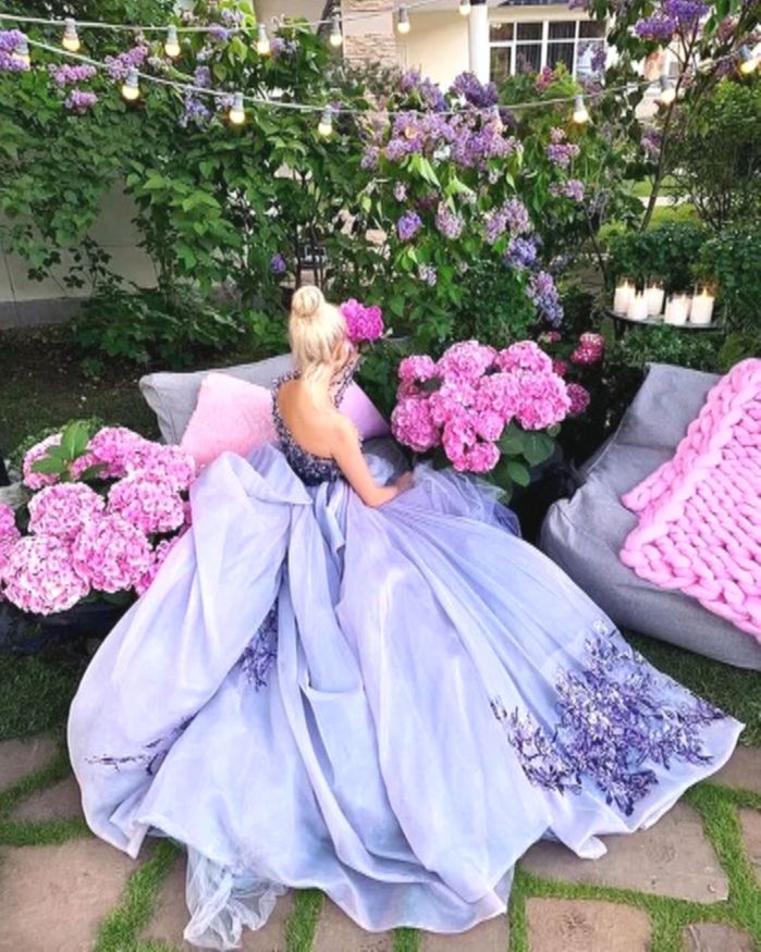 лёгкий лиловый наряд из органзы с воланами;