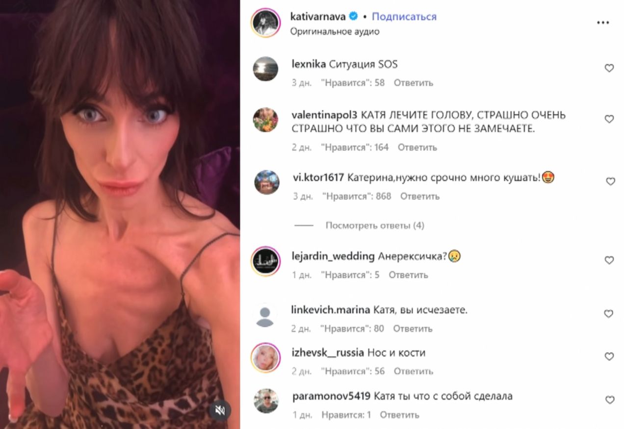 «Катя, лечите голову!», «Вы мне нравитесь, но выглядите вы, как бы помягче выразиться, короче, вы скоро растаете»; «Я, конечно, все понимаю, что хотелось похудеть, но не надо было доводить свое тело до такого состояния»; «Покушайте! Срочно!» — высказываются подписчики артистки.