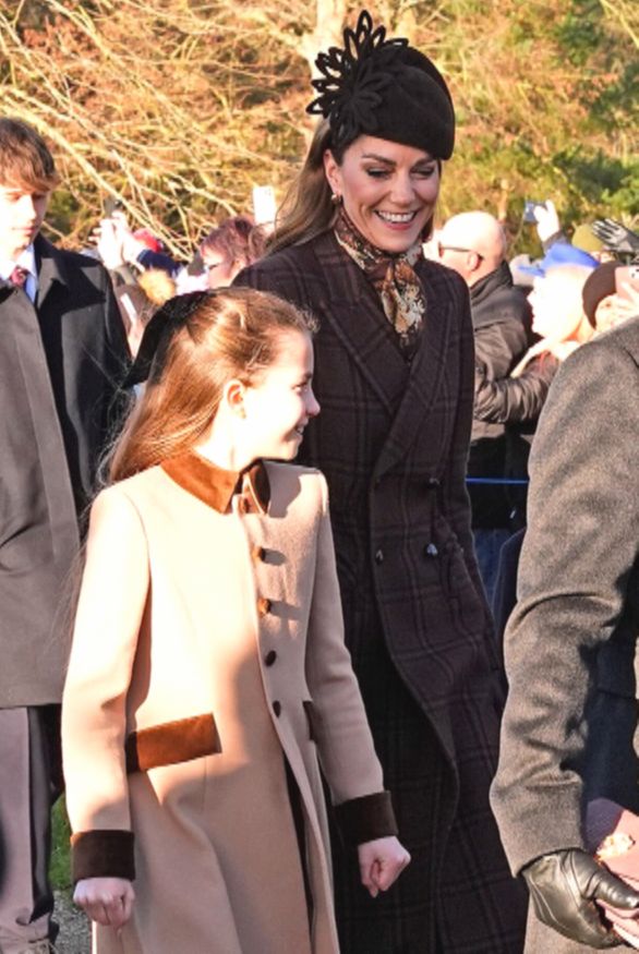 Принц и принцесса Уэльские приехали на службу с детьми – 12-летним Джорджем, 10-летней Шарлоттой и 7-летним Луи. Кейт Миддлтон выбрала наряд в оттенках шоколада. Она надела шляпку-таблетку, декорированную снежинками из такой же плотной ткани. Компанию ей составили двубортное пальто миди в крупную клетку, шелковый шарф на груди и замшевые сапоги на каблуках.