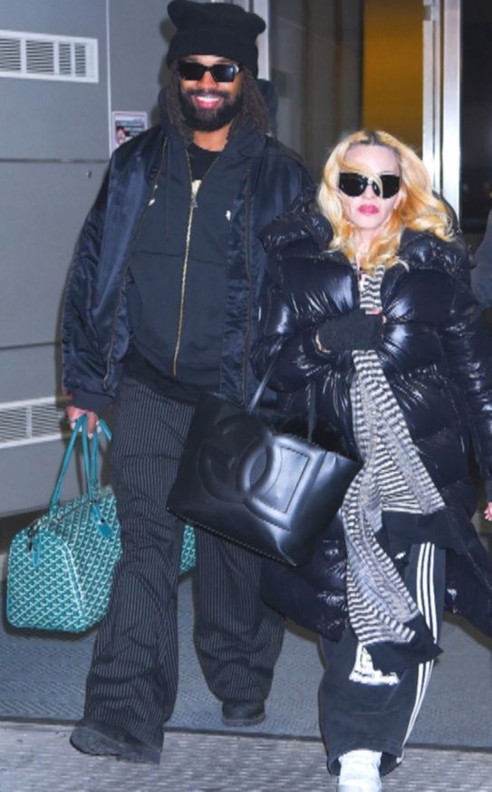 Мадонна дополнила образ эффектными колготками, блейзером оверсайз и лоферами. Финальным штрихом стали голубые латексные перчатки. Артистку сопровождал ее 29-летний бофренд Аким Моррис.