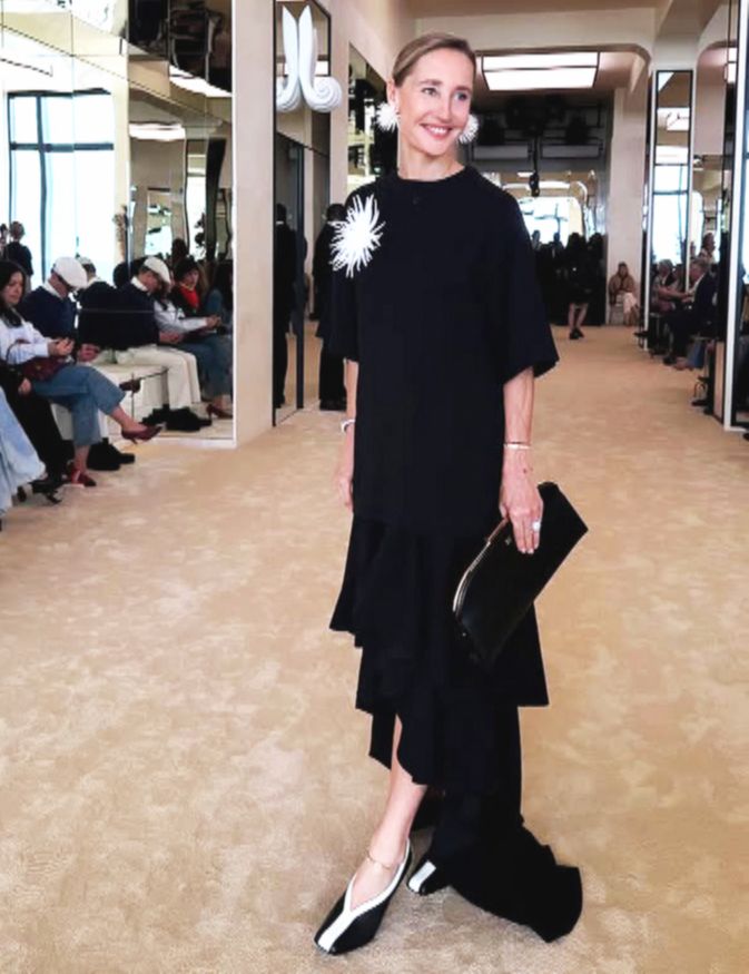 . 65-летняя британская актриса надела черно-белый аутфит в офисном стиле. Шелковую блузку с золотыми пуговицами она сочетала с удлиненным блейзером, плиссированной мини-юбкой и причудливыми мюлями с квадратным носом.