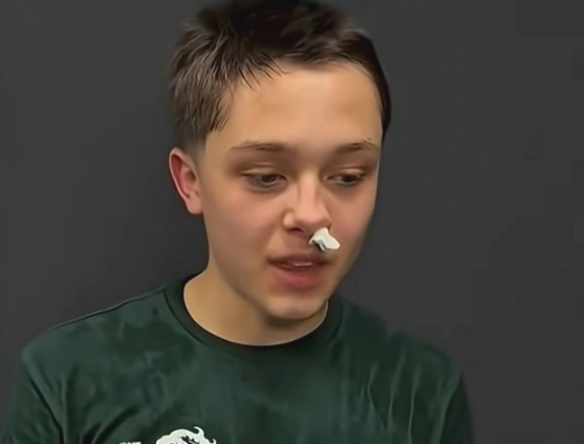 И даже когда на снимках видно, что нос у него был недавно травмирован, он продолжает тренироваться.