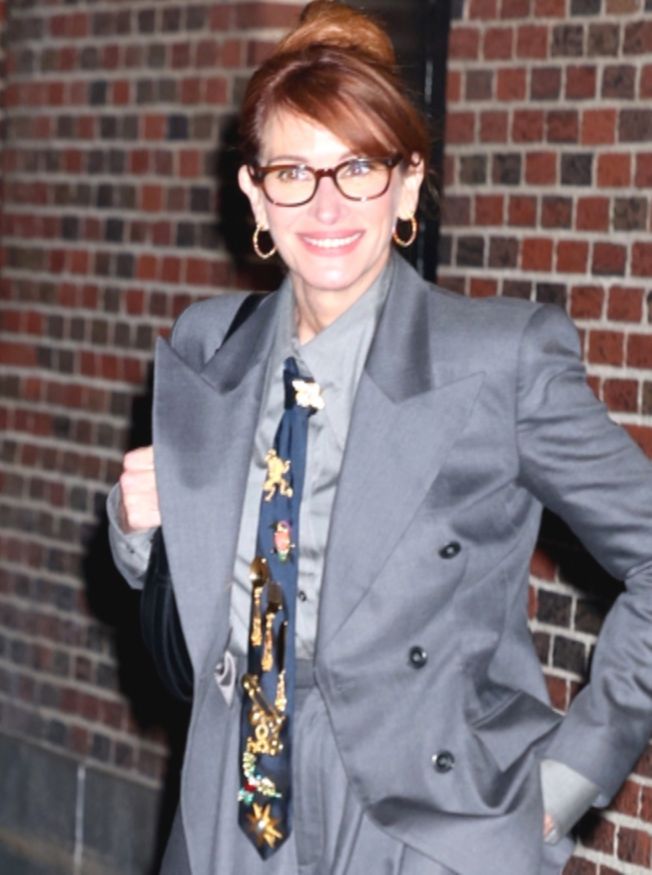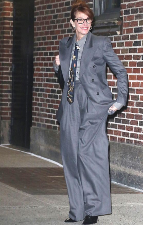 Голливудская звезда стала гостьей «Позднего шоу со Стивеном Колбертом» в Нью-Йорке. Джулию Робертс заметили рядом со студией в Мидтауне на Манхэттене. Она была одета в светло-серую шелковую рубашку и костюм на несколько тонов темнее. Стильный приталенный блейзер с широкими лацканами дополнили брюки свободного кроя с высокой посадкой.