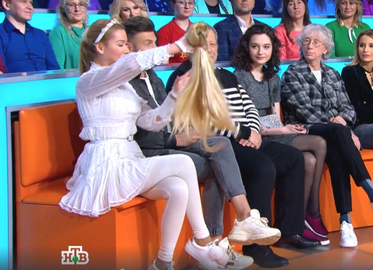 А теперь к самому обсуждаемому моменту — парикам. Этот вопрос ей задают часто. На фоне этого, блондинка расставила точки над «и» и пришла на съёмки программы «Звезды сошлись» с париком в руках. На голове у неё был обычный хвост из собственных волос.