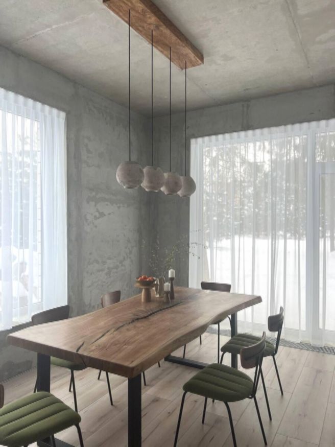 Почти весь первый этаж отдали под просторную гостиную. Помещение поделено на зоны, но при этом остаётся цельным и открытым. В обеденной части стоит массивный деревянный стол с нарочито неровной столешницей и мягкие стулья спокойного оливкового цвета. Стены здесь оставили без отделки, а пол выложили светлой инженерной доской.