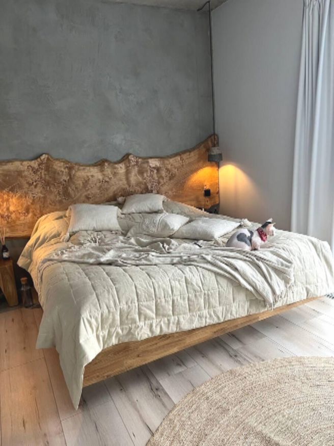 Спальня Марии оформлена в духе минимализма. Натуральные материалы, простая мебель, никаких перегрузов. В одном углу — зона отдыха с мягким креслом, лампой и картинами, на полу круглый ковёр из жгута. В другом — рабочий стол на деревянных ножках и кресло с белой меховой обивкой.