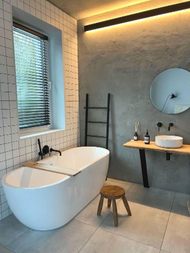 Ванная выглядит так же сдержанно, как и остальной дом. У стены — ванна из литьевого камня, рядом чёрная лестница и простая деревянная табуретка. Пол выложен серым керамогранитом, стены частично окрашены, частично облицованы белой плиткой.